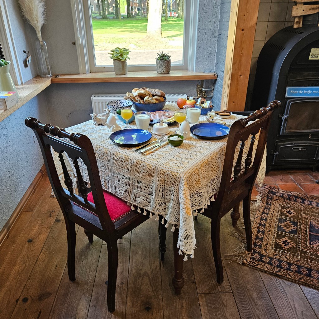U kunt gebruik maken van ontbijt tussen 7:30 en 10:00. U kunt aangeven of u op de kamer, in Dwingeloo zelf of in het gezellige atelier wilt ontbijten, met een geweldig uitzicht op de Brink. Het ontbijt is volledig verzorgd in het atelier, wilt u op de kamer ontbijten dan spreken we een tijd af wanneer de ontbijtmand voor de deur staat. Wij verzorgen op verzoek een glutenvrij ontbijt, wel graag van te voren aanmelden, voor alle andere diëten denken wij dat er voor iedereen wel iets tussen zit. Na 10.00 gaat het atelier open en kunnen kijkers binnenwandelen.